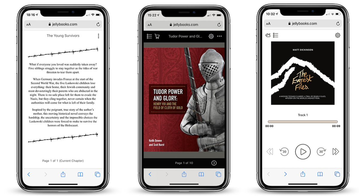 The Jellybooks Cloud Reader supports not only narrative books such as novels, but also illustrated books and audiobooks. From children’s books to thrillers, cook books to romance novels, Booker-winning novels to audiobooks on pop culture, all formats and genres are supported.