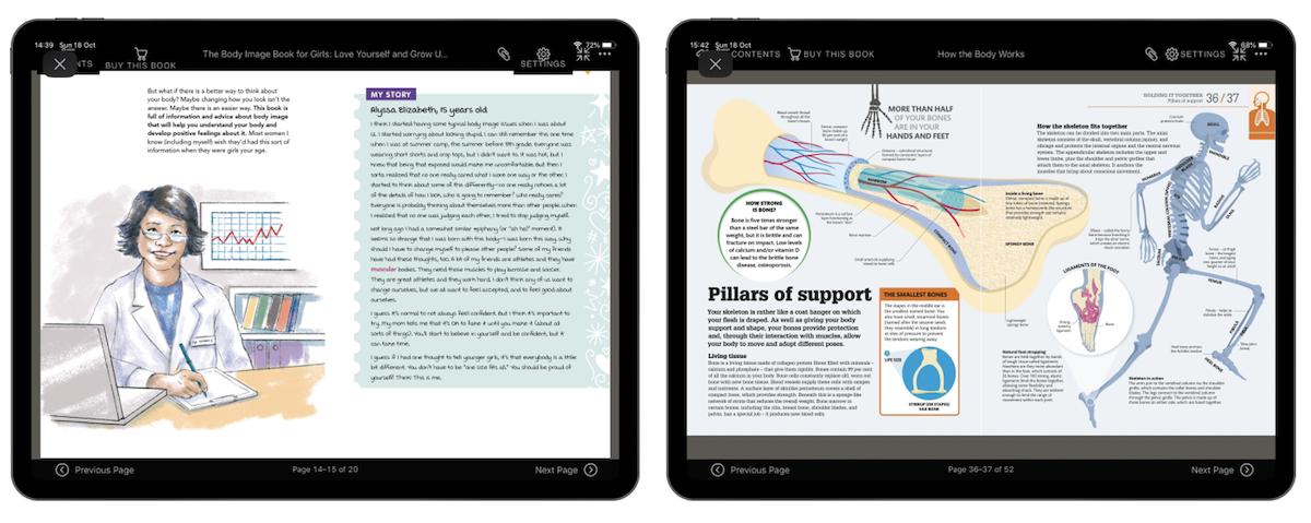from left to right: excerpt from the illustrated book “The Body Image Book for Girls: Love Yourself and Grow Up Fearless” by Cambridge University Press and “How the Body Works” by DK – all shown in landscape mode on a tablet