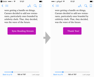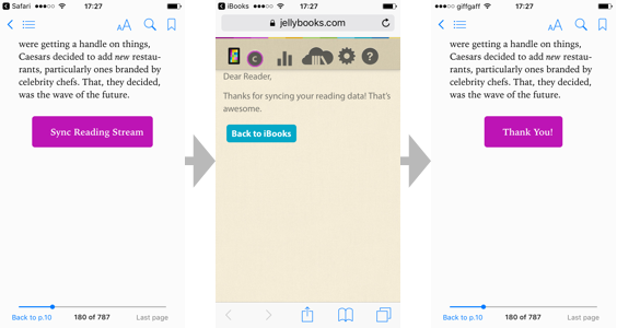 If the data has been successfully sent, the purple “Sync Reading Stream” button will switch to a purple “Thank You” button. Depending on the device, app, and operating system, you might see a web page saying that the data has been successfully sent, but in many cases, it is only the button that will change. If you are using Adobe Digital Editions (ADE), the app may occasionally get stuck on the “data received” page. This is a bug in the ADE application (generally a very buggy reading application), and not a Jellybooks error. If this happens, just close the book and re-open it. A workaround, if this becomes annoying, is to send data only at the end of a reading session when using ADE.